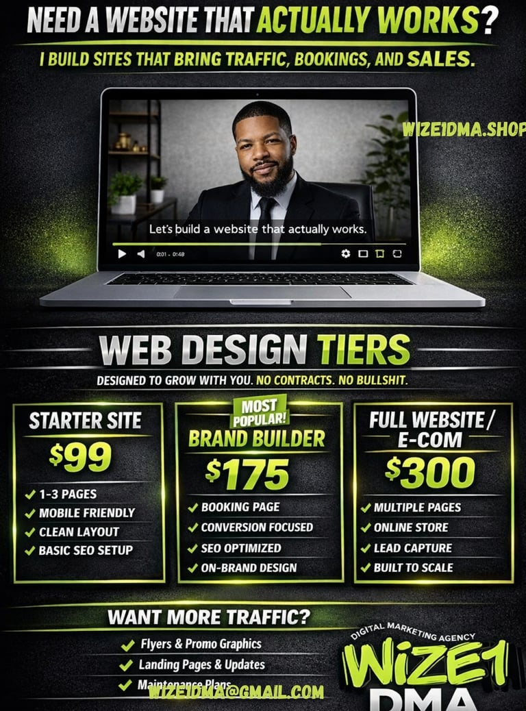 Design, mobile responsiveness, contact forms, basic SEO, and revisions.